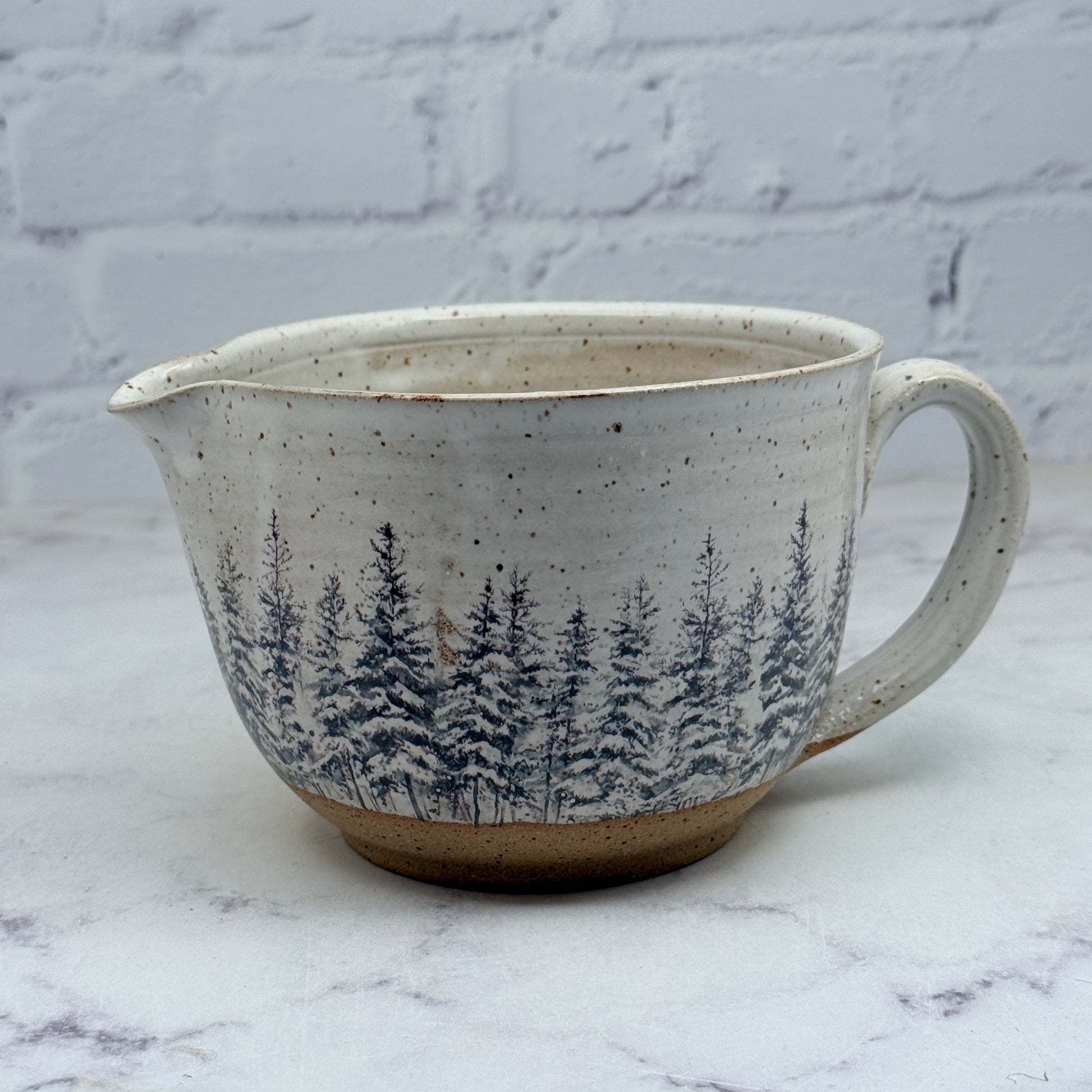This bowl has a unique design throughout. The bottom is left unglazed. This bowl has a handle and a spout making it great for mixing batter or eggs and then pouring into a pan. They would make a great addition to your kitchen or a great gift for a loved one.