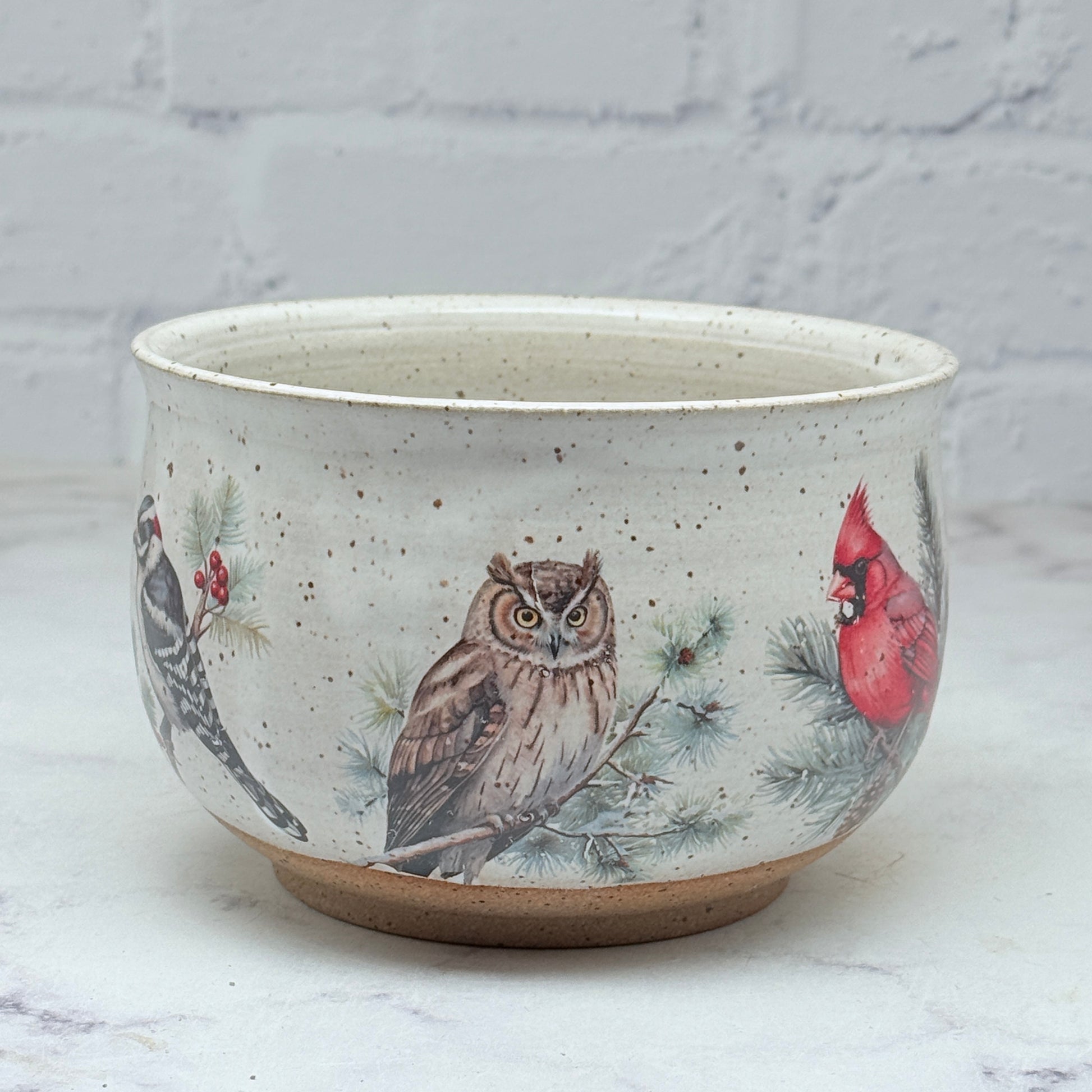 This bowl is a great versatile size. It is decorated with a speckled white glaze with overglaze decals. It would make a great addition to your kitchen or a great gift for a loved one.