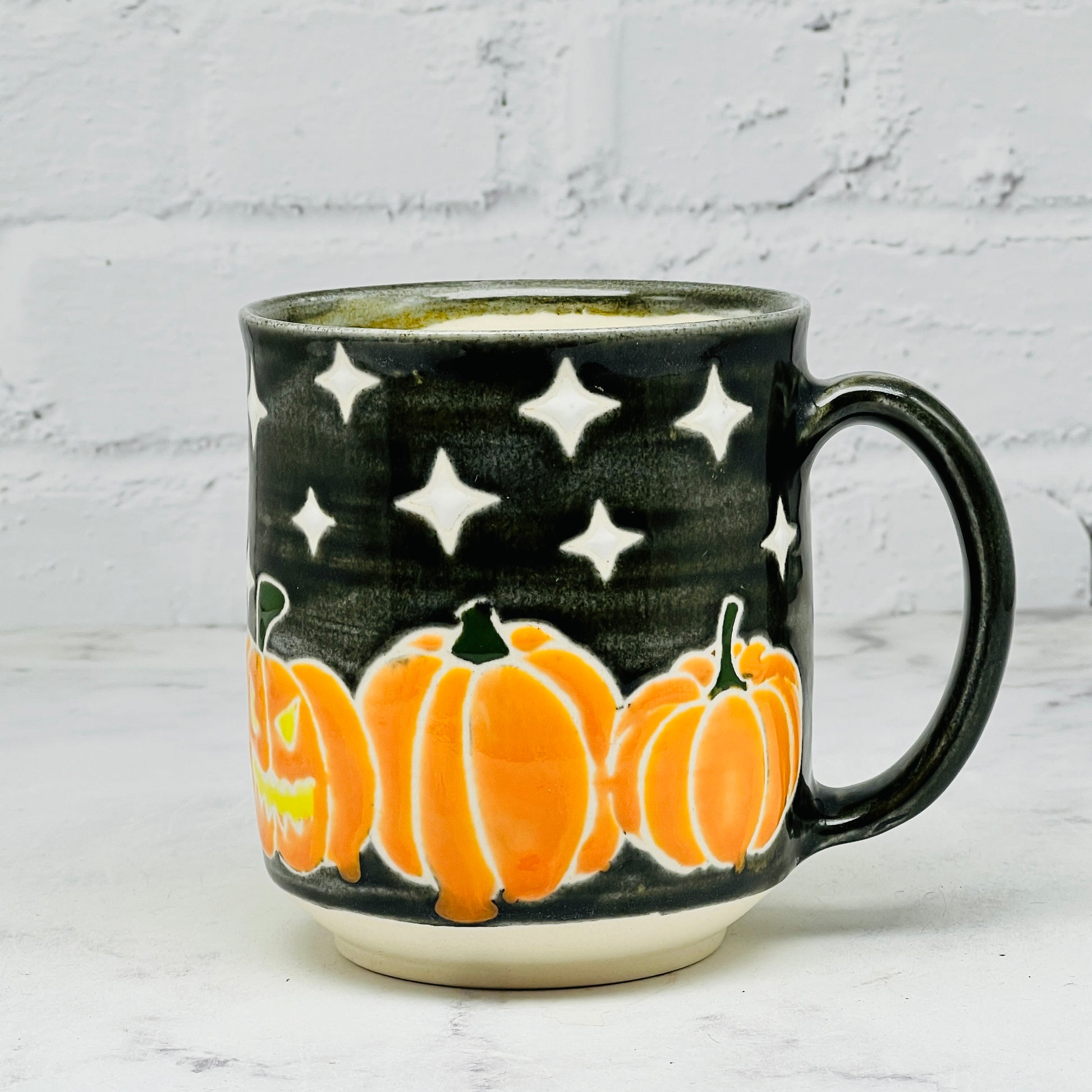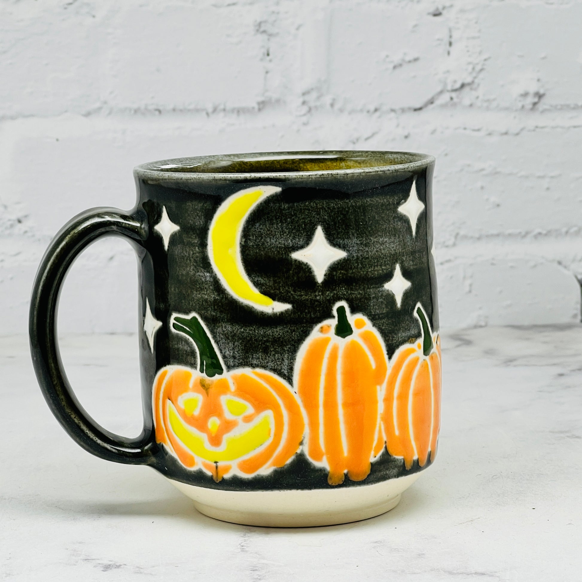This beautiful mug has unique design throughout. The outlines of the designs are left unglazed. It would make a great addition to your collection or a great gift for a loved one.