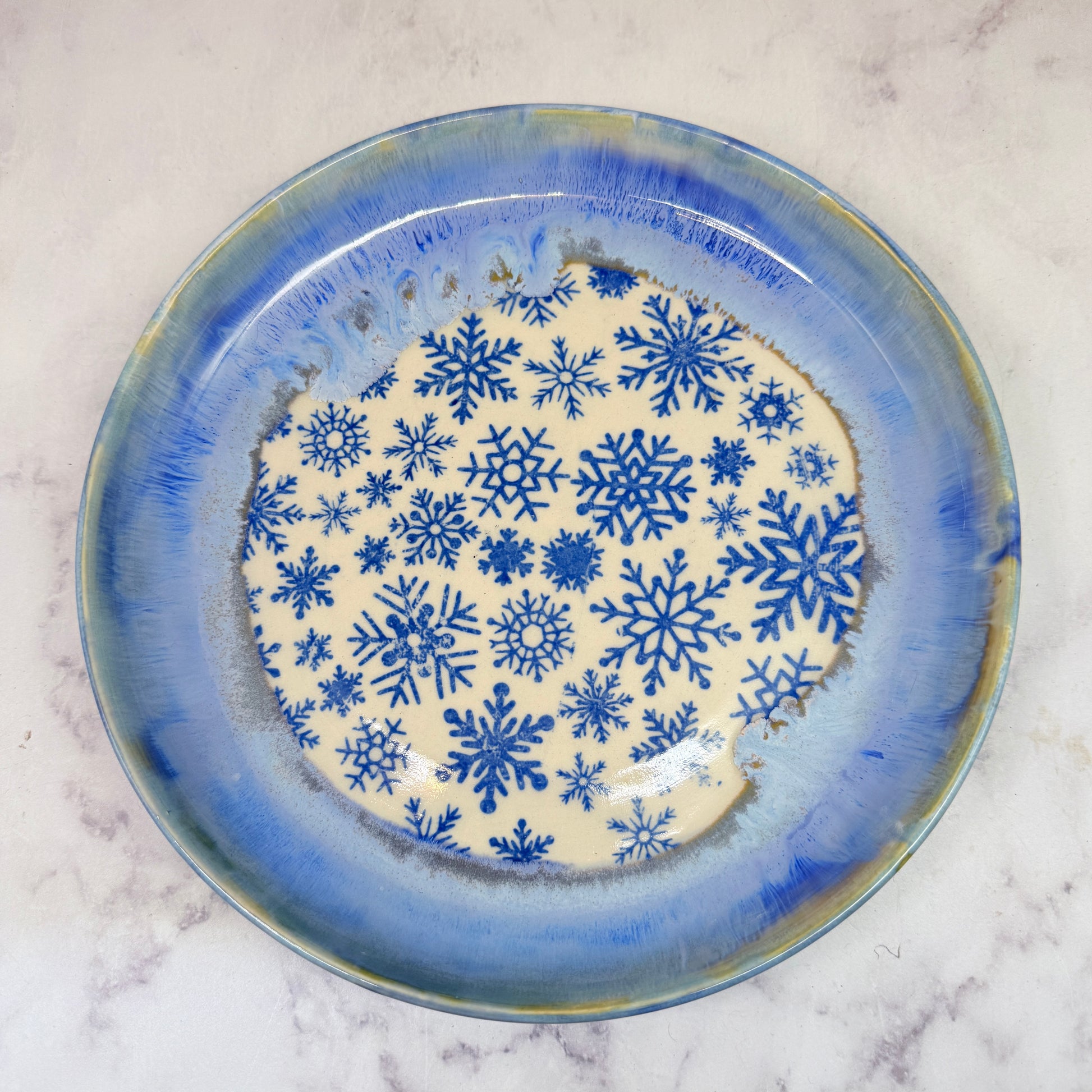 This plate is made with a wide foot and low sides making it perfect for cookies and bars. It is decorated with a unique design throughout. It would make a great addition to your collection or a great gift for a loved one.