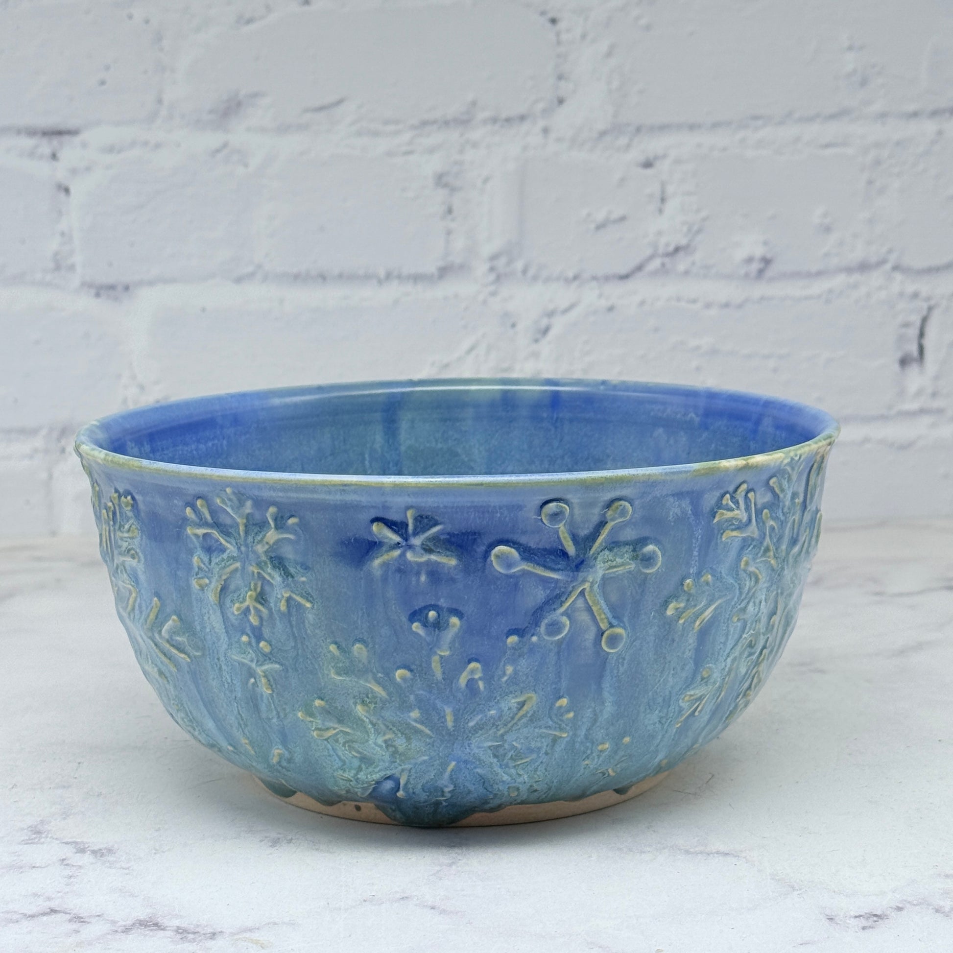 This bowl is a great versatile size. It is decorated with a beautiful raised snowflake design throughout. It would make a great addition to your kitchen or a great gift for a loved one.