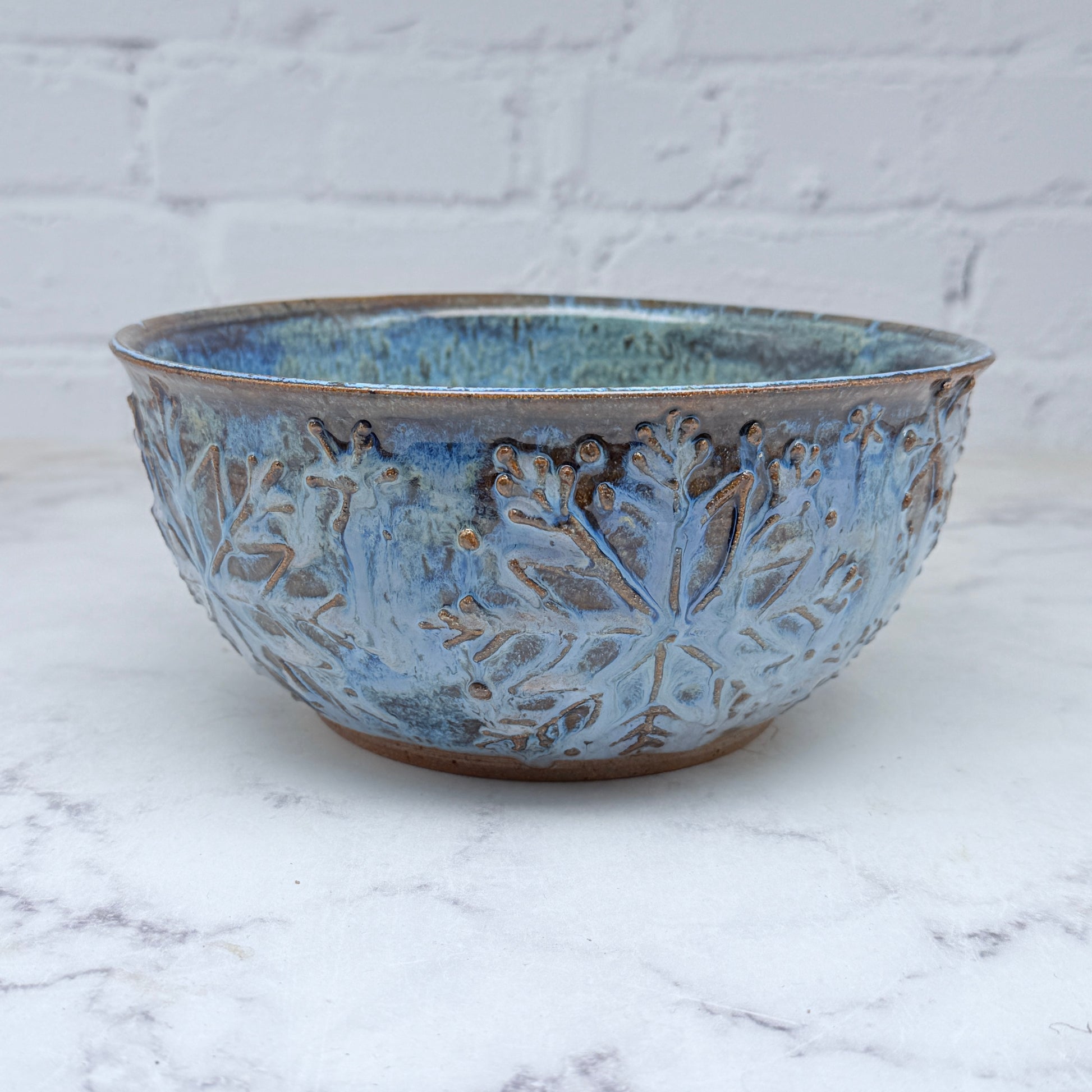 This bowl is a great versatile size. It is decorated with a beautiful raised snowflake design throughout. It would make a great addition to your kitchen or a great gift for a loved one.