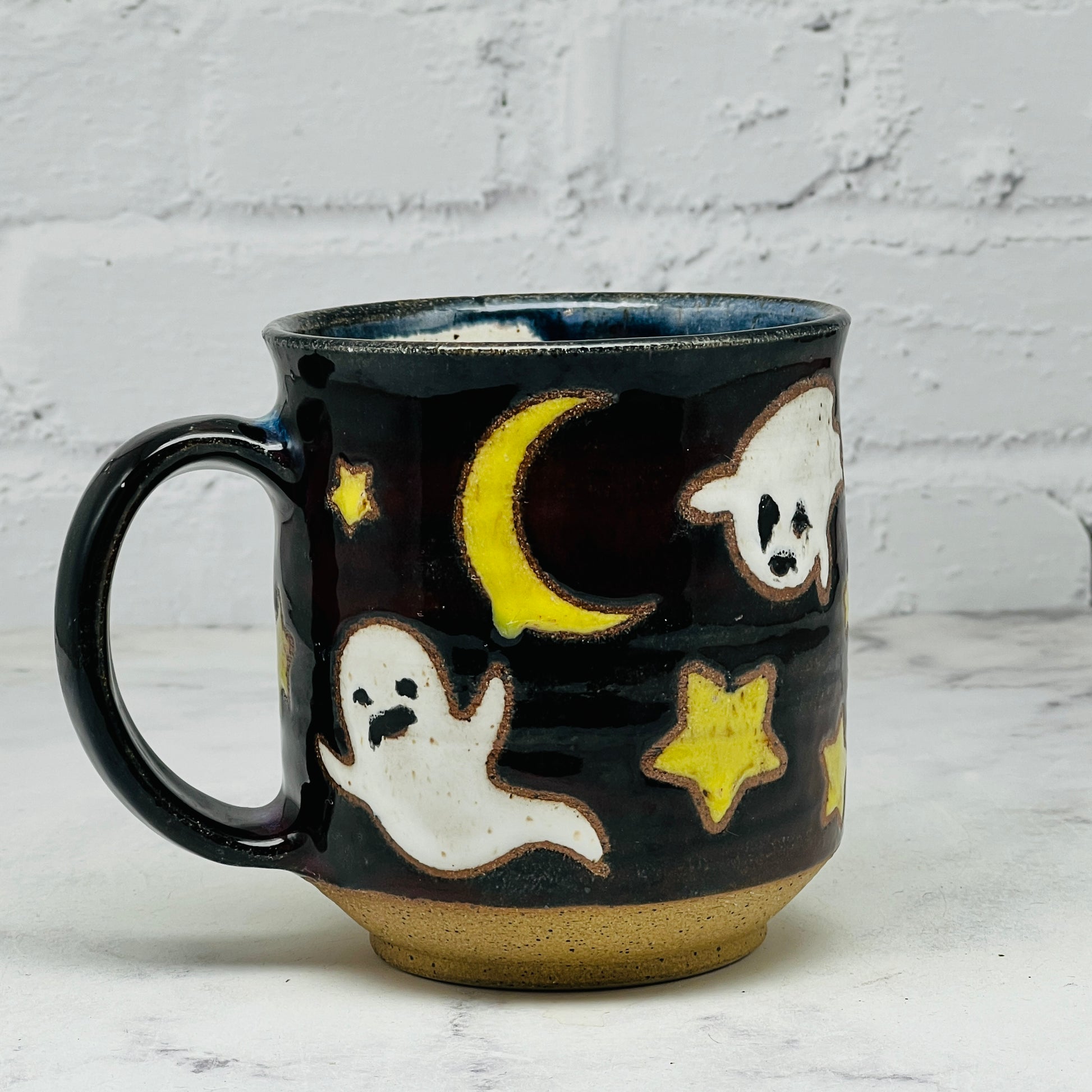 This beautiful mug has unique design throughout. The outlines of the designs are left unglazed. It would make a great addition to your collection or a great gift for a loved one.