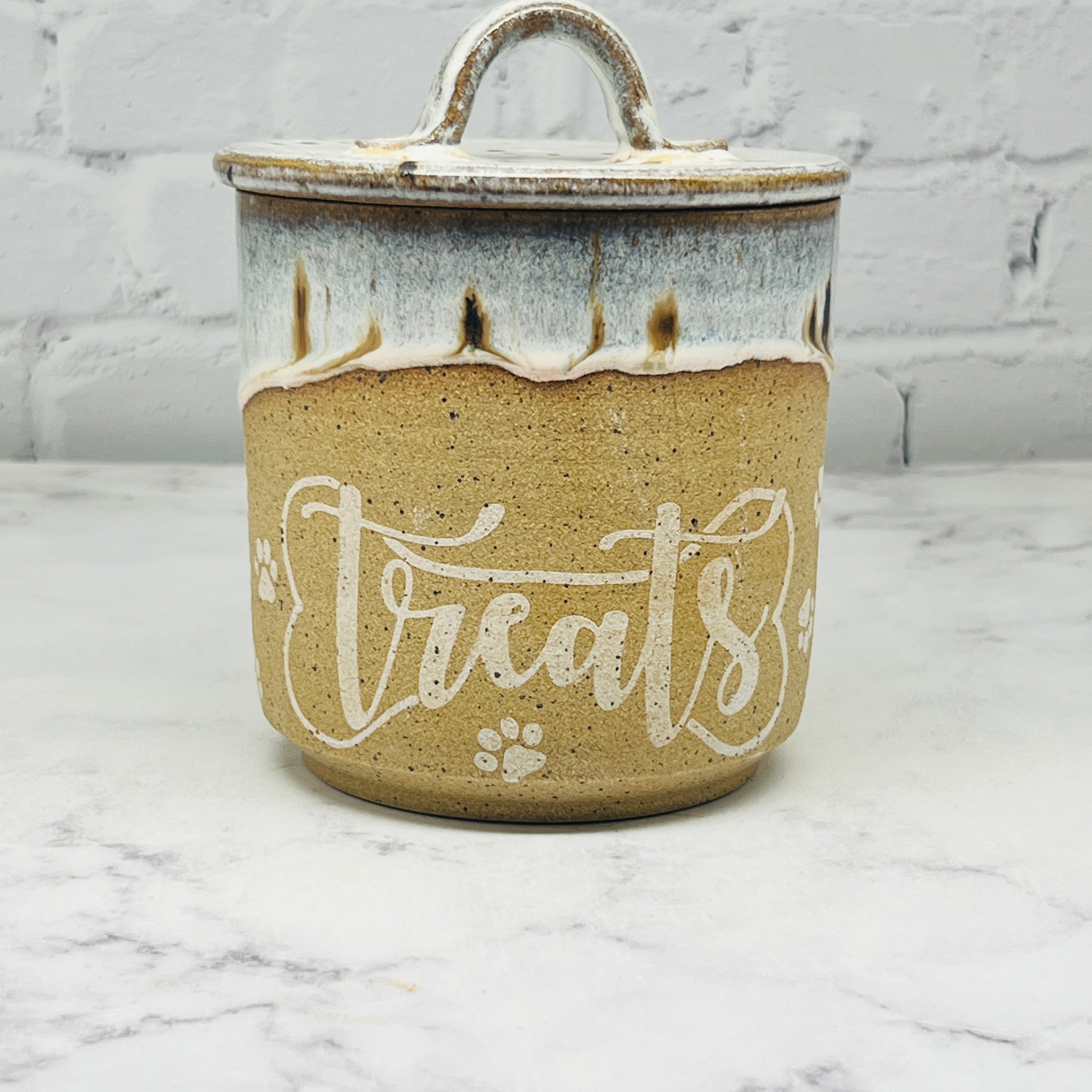 This adorable container has a beautiful glaze on the top and a unique design at the bottom that is left unglazed. It would make a cute and functional way to store pet treats.