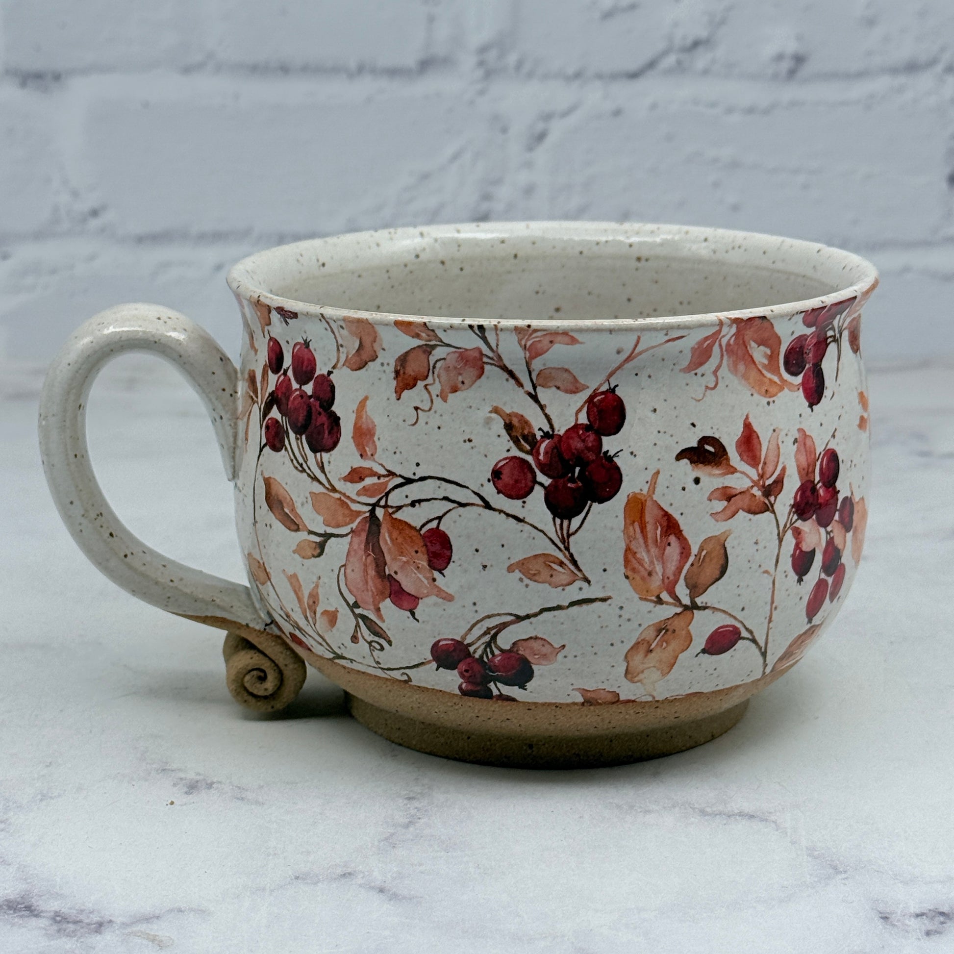 This beautiful mug has unique decal design throughout. The bottom of the mug is left unglazed. It would make a great addition to your collection or a great gift for a loved one.