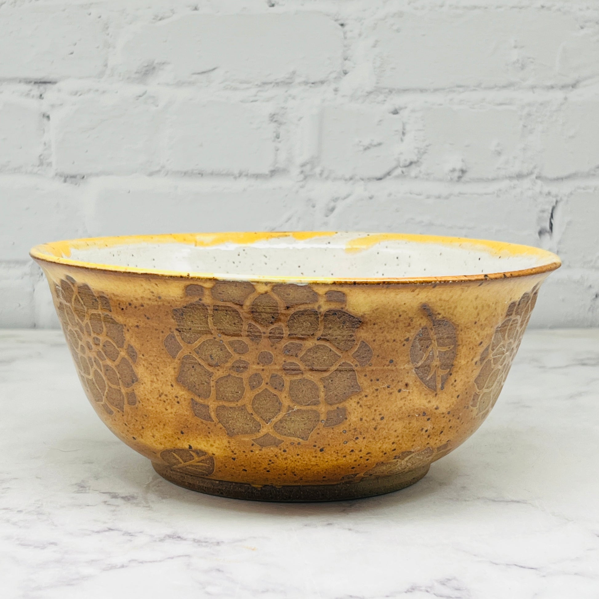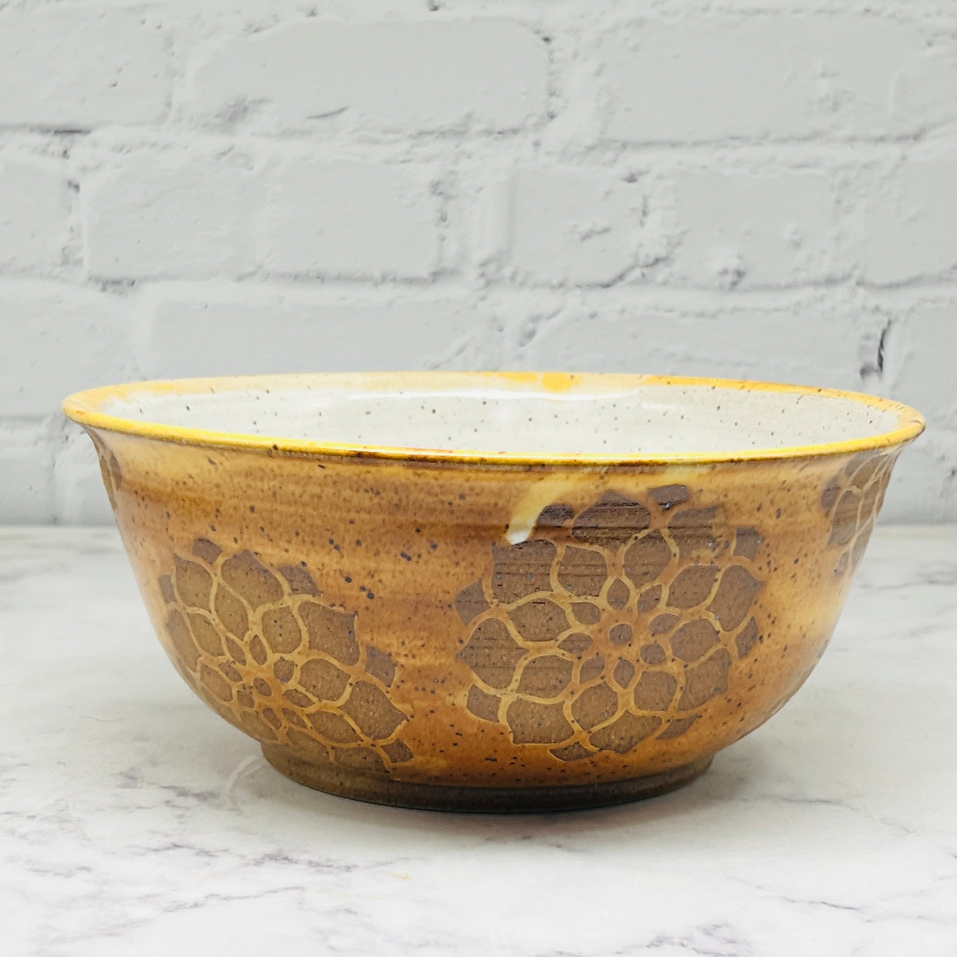 This bowl is a great versatile size. It is decorated with a speckled white glaze with overglaze decals. It would make a great addition to your kitchen or a great gift for a loved one.