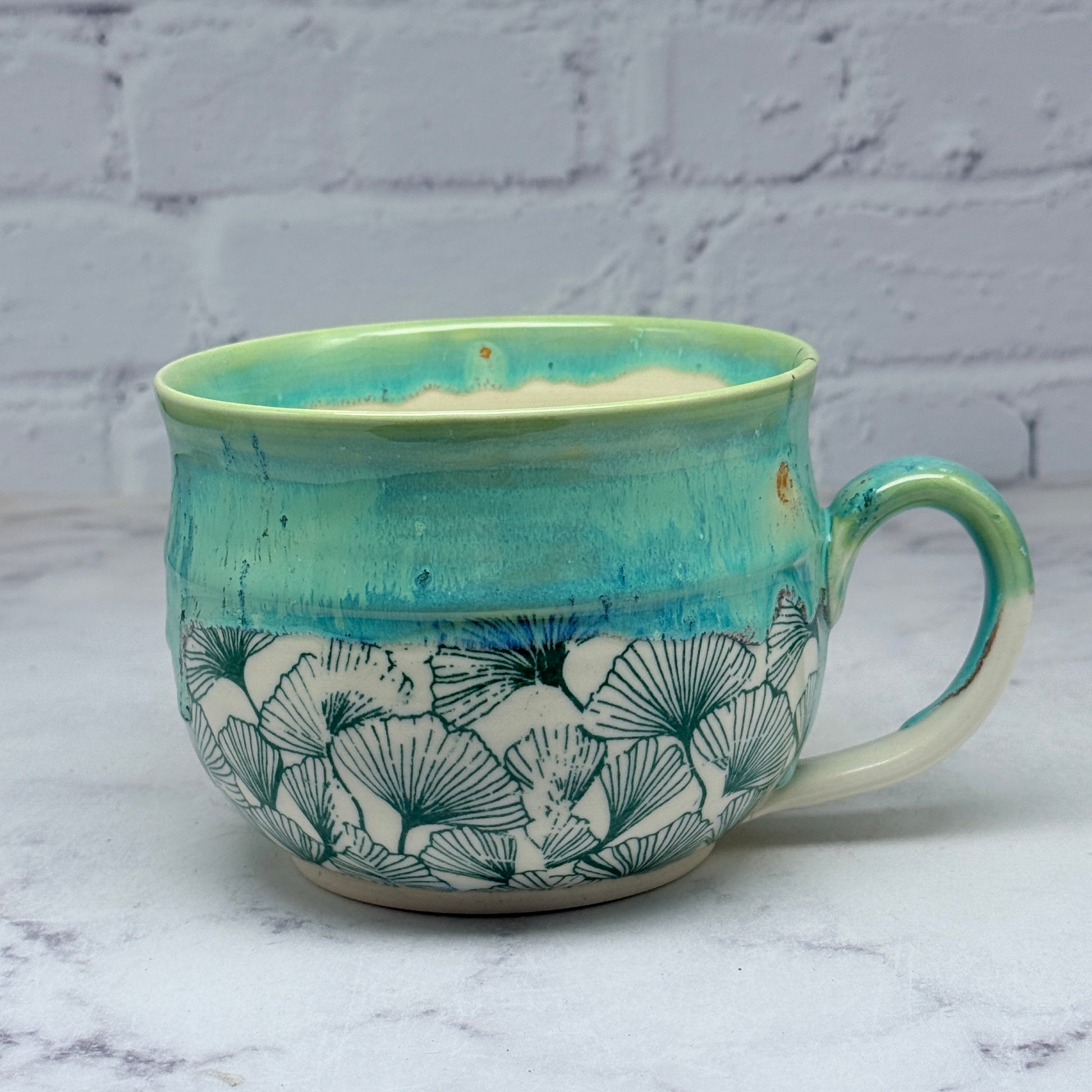 This adorable mug has unique design at the bottom and a beautiful glaze at the top. It would make a great addition to your collection or a great gift for a loved one. The shape of this mug is shorter and wider, so it would be great for soup, cocoa bombs, or a cappuccino.