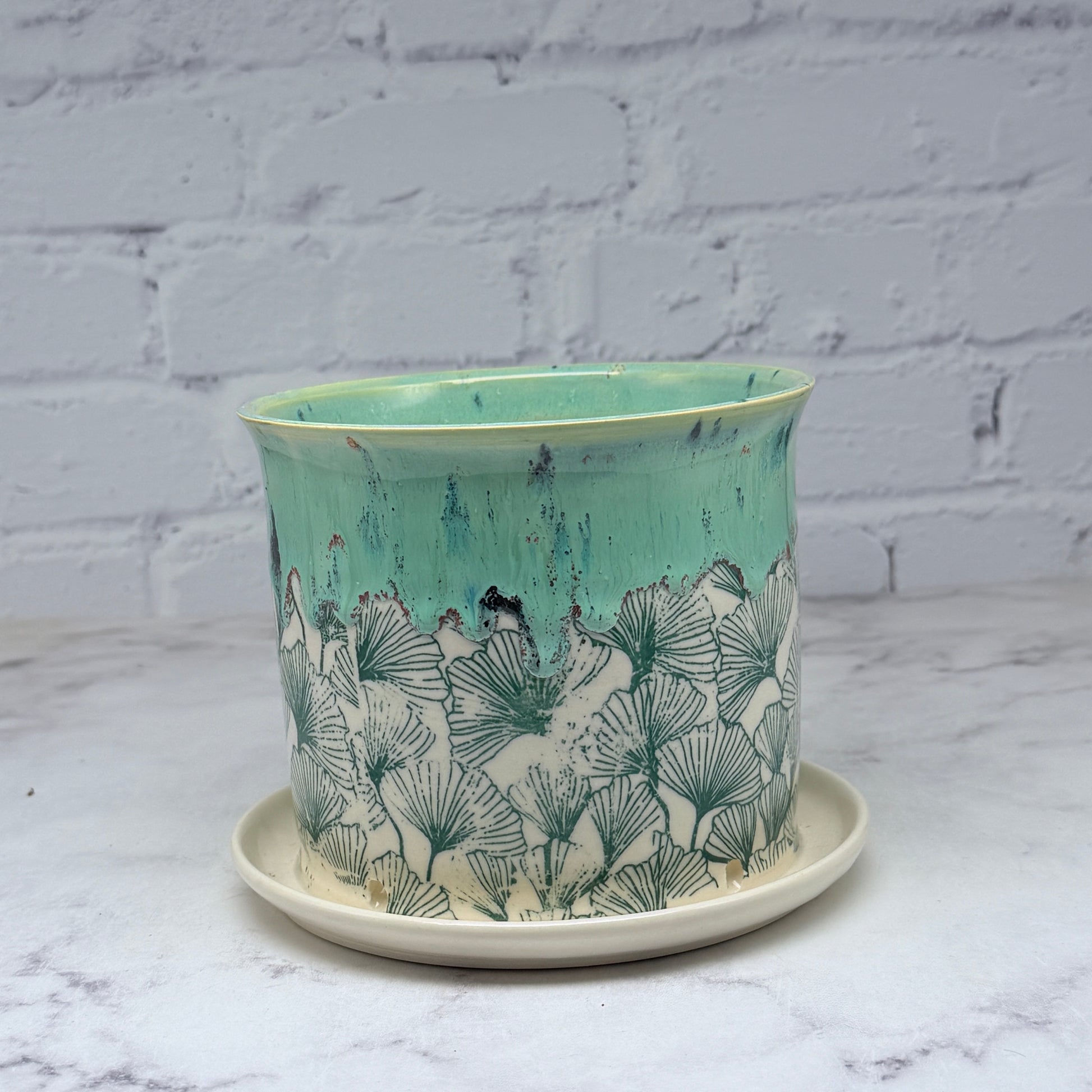 This planter has a beautiful glaze at the top and a unique design at the bottom.