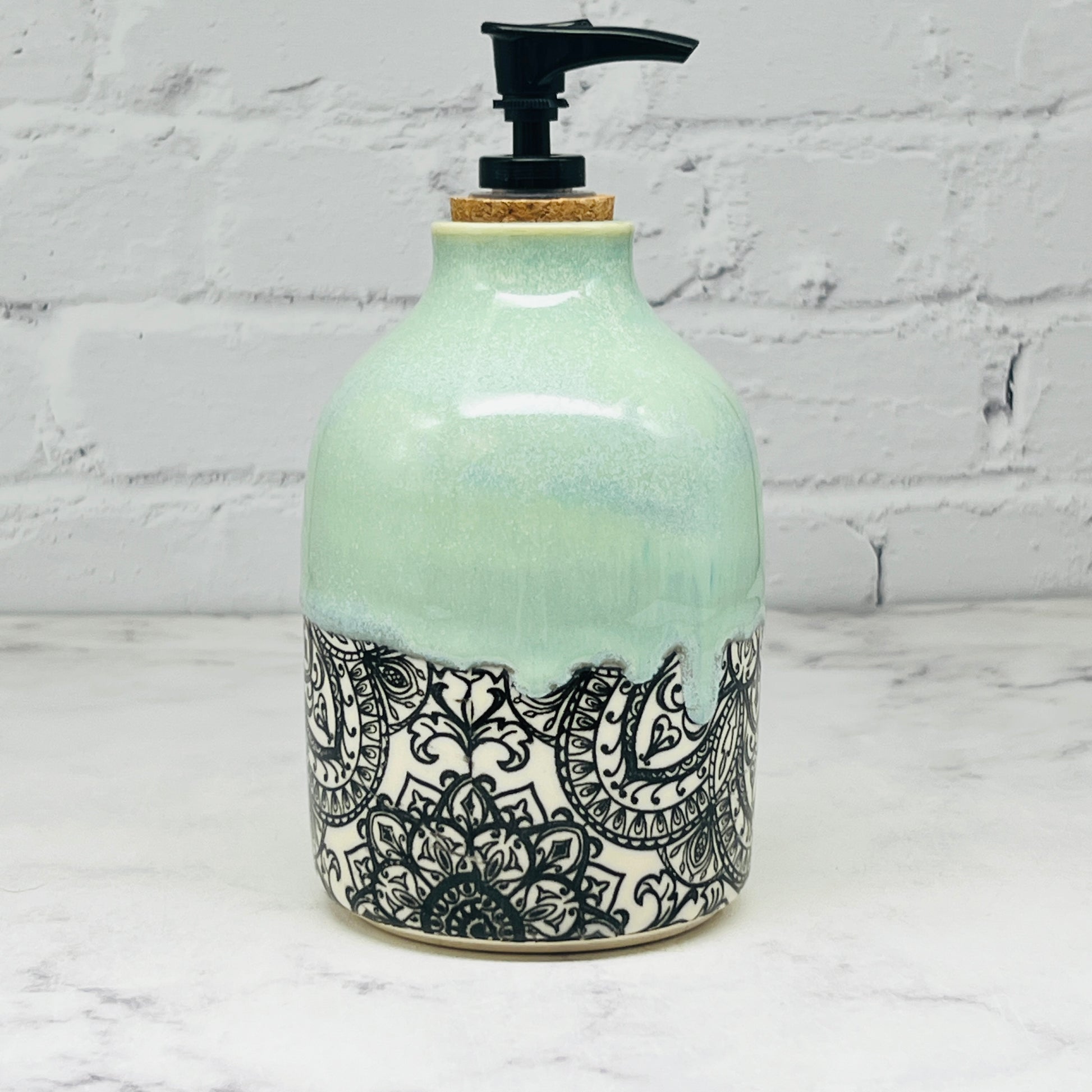 This soap dispenser bottle has a unique design and glaze combo. It would make a great addition to your home decor or a excellent gift for a loved one.