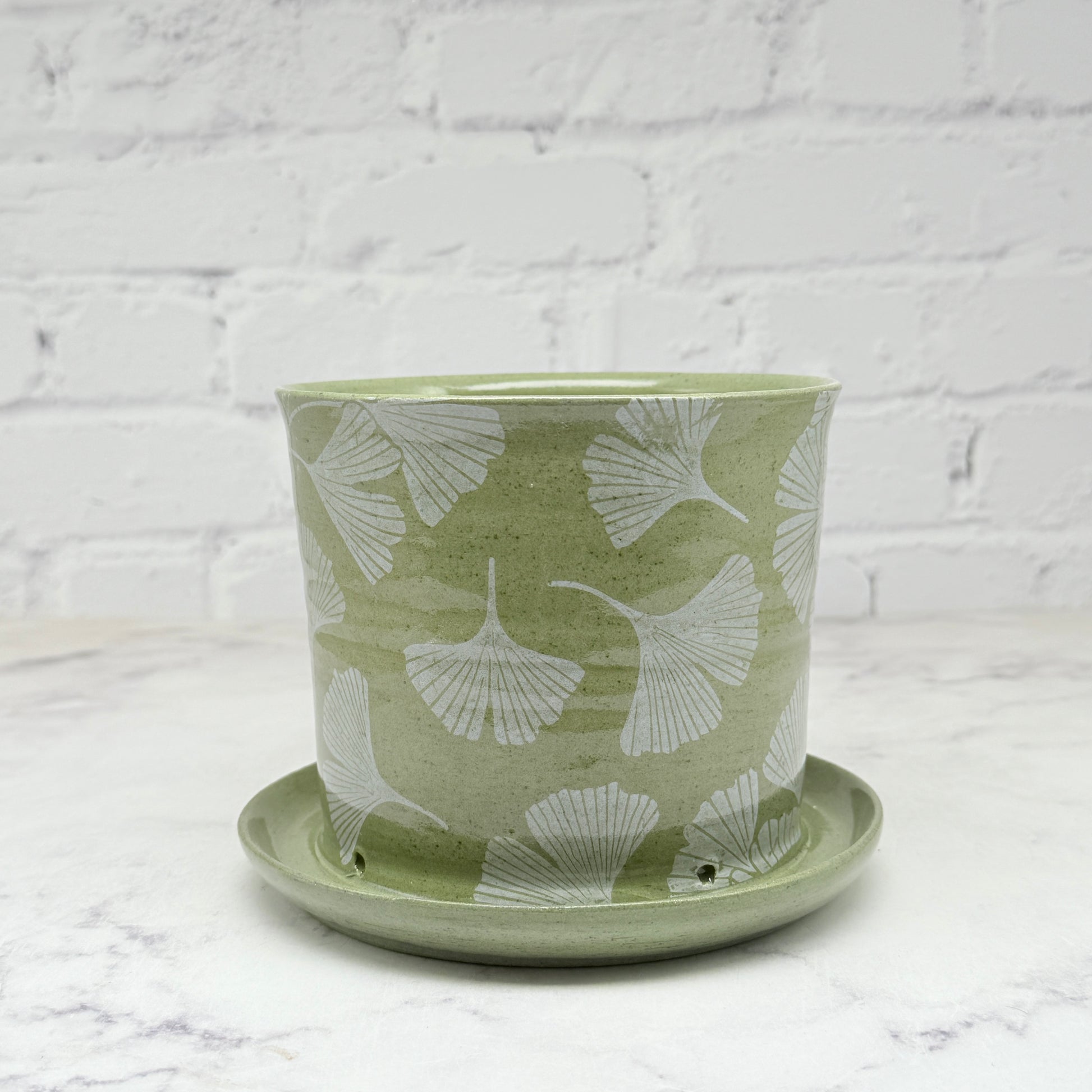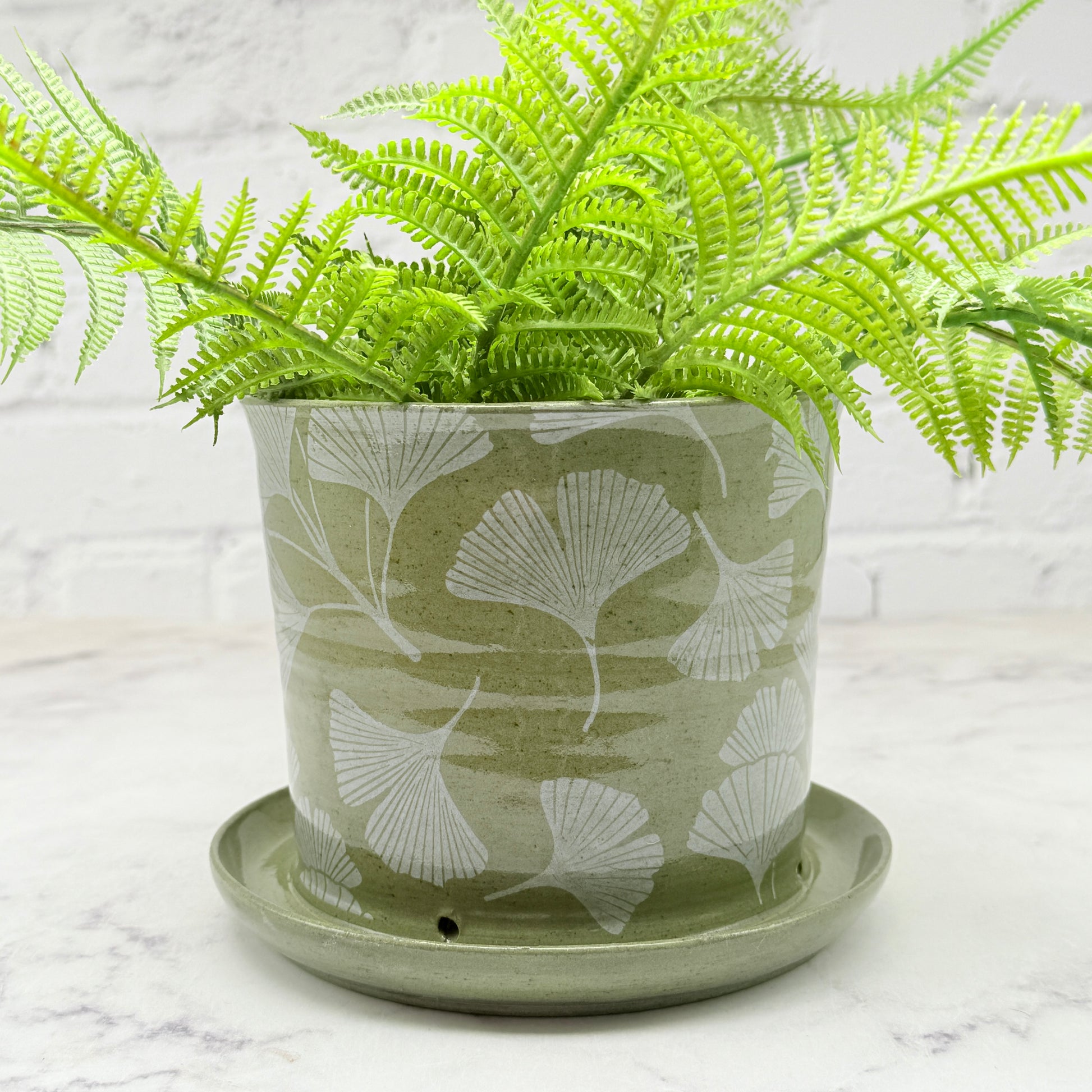 This beautiful planter is glazed has a unique design throughout on colored stoneware clay.