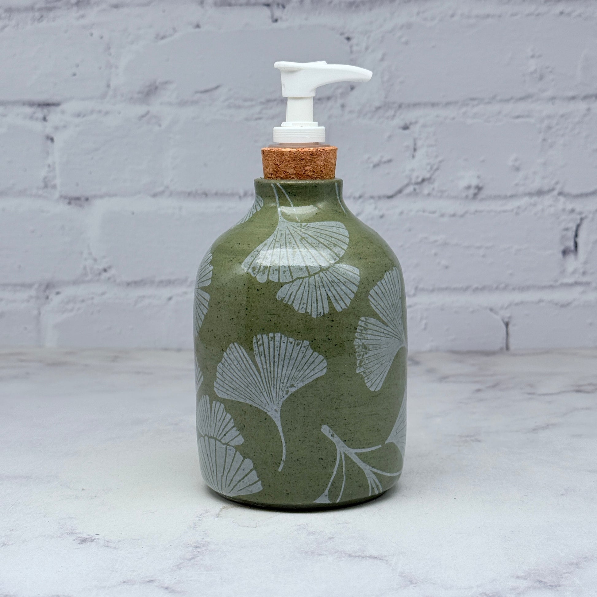 This soap dispenser bottle has a unique design throughout on colored stoneware clay. It would make a great addition to your home decor or a excellent gift for a loved one.
