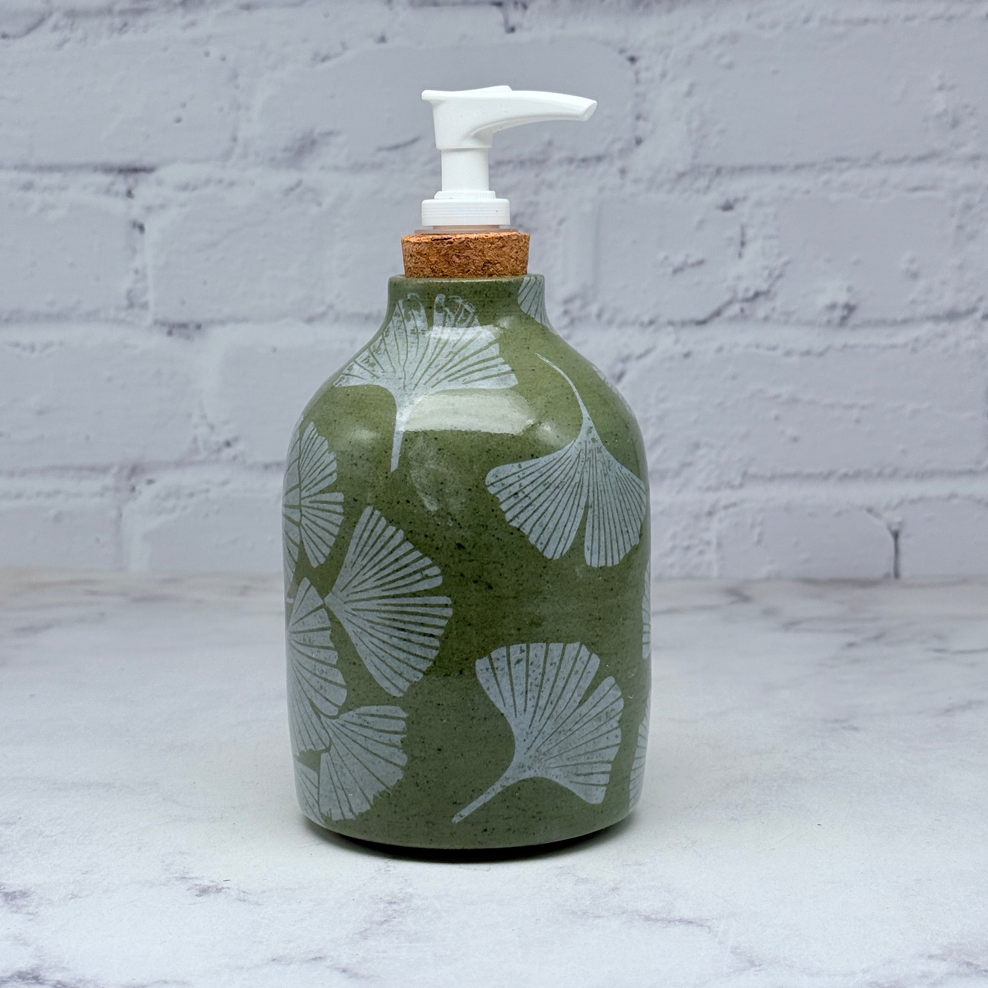 This soap dispenser bottle has a unique design throughout on colored stoneware clay. It would make a great addition to your home decor or a excellent gift for a loved one.