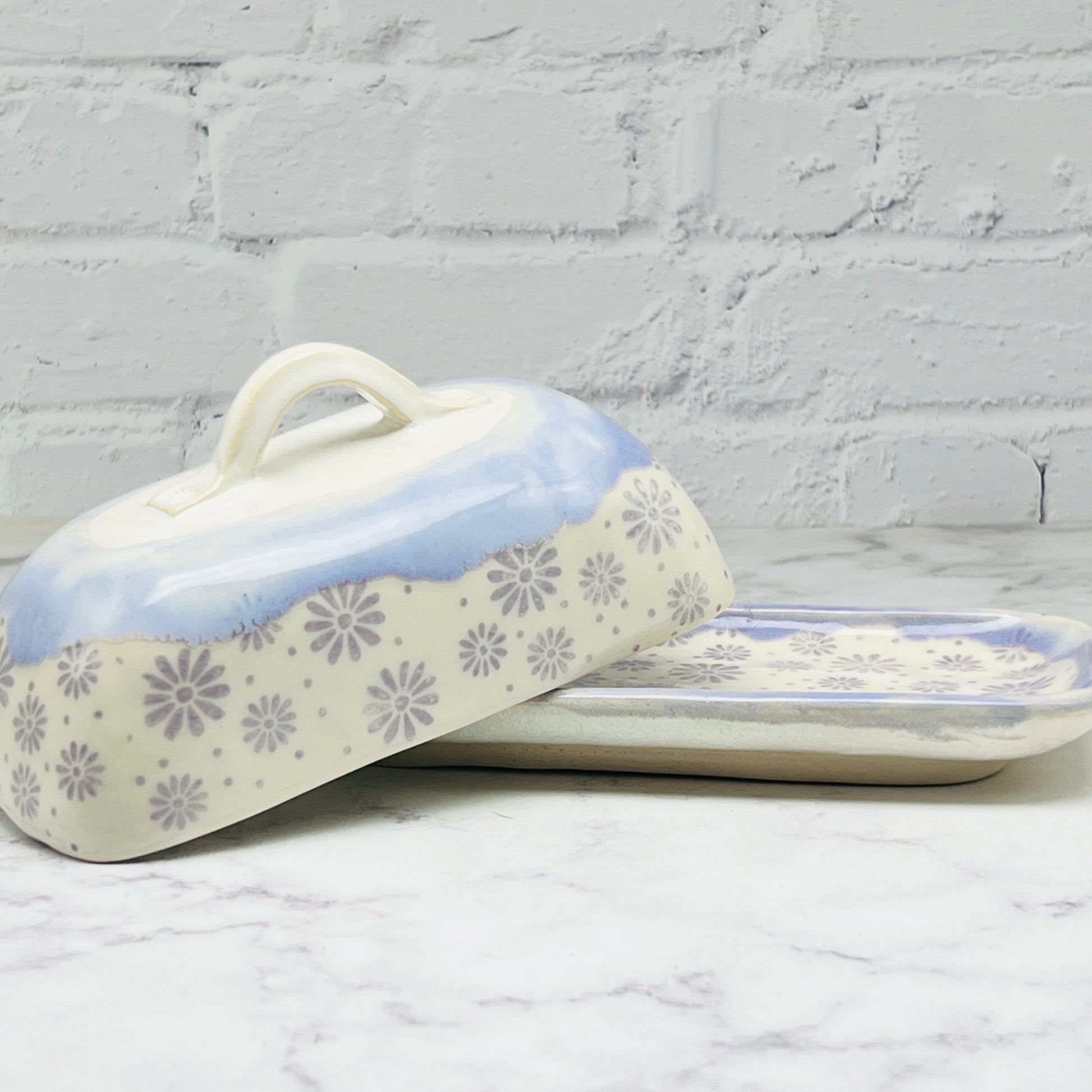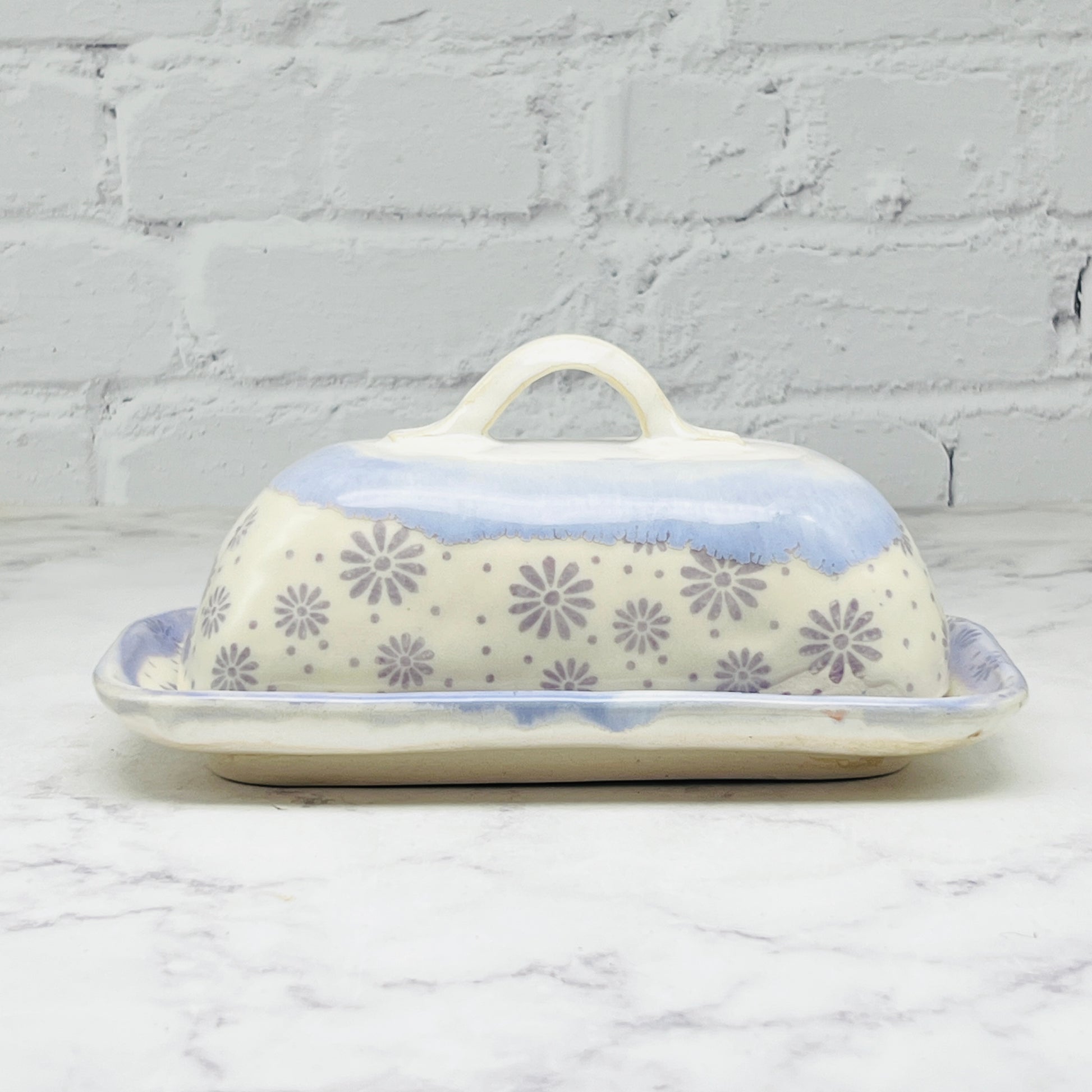 This adorable lidded butter dish has a unique design on top with a matching design on the bottom. It would make a great addition to your home or a great gift for a loved one.