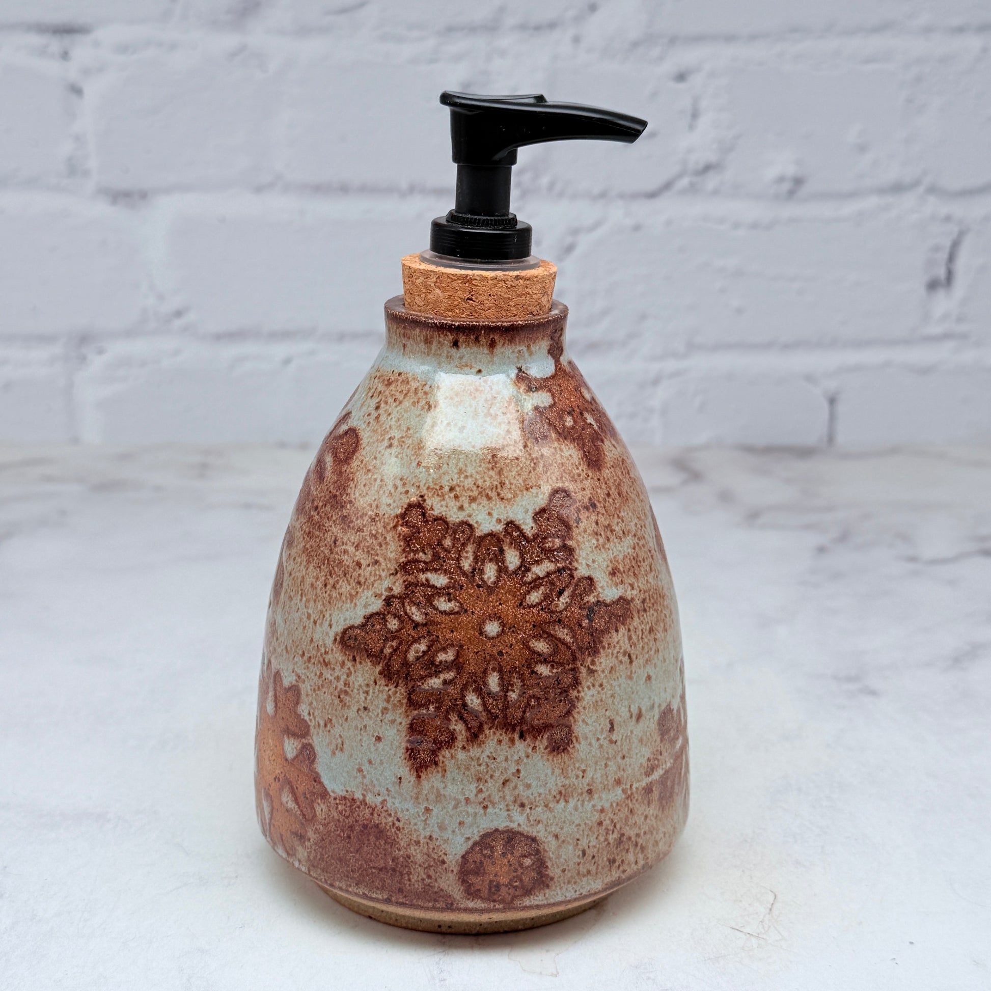 This soap dispenser bottle has a unique unglazed snowflake design throughout. It would make a great addition to your home decor or a excellent gift for a loved one.