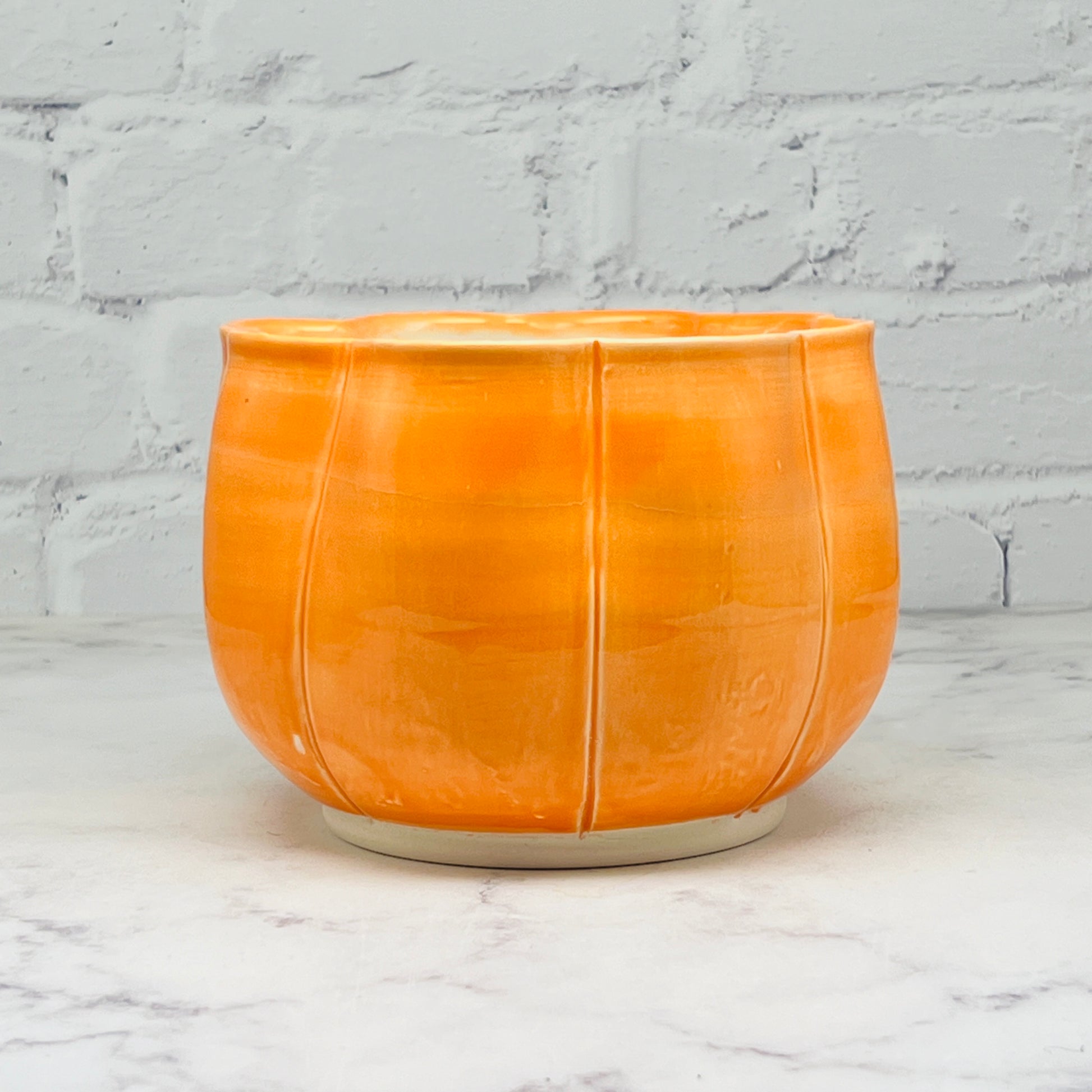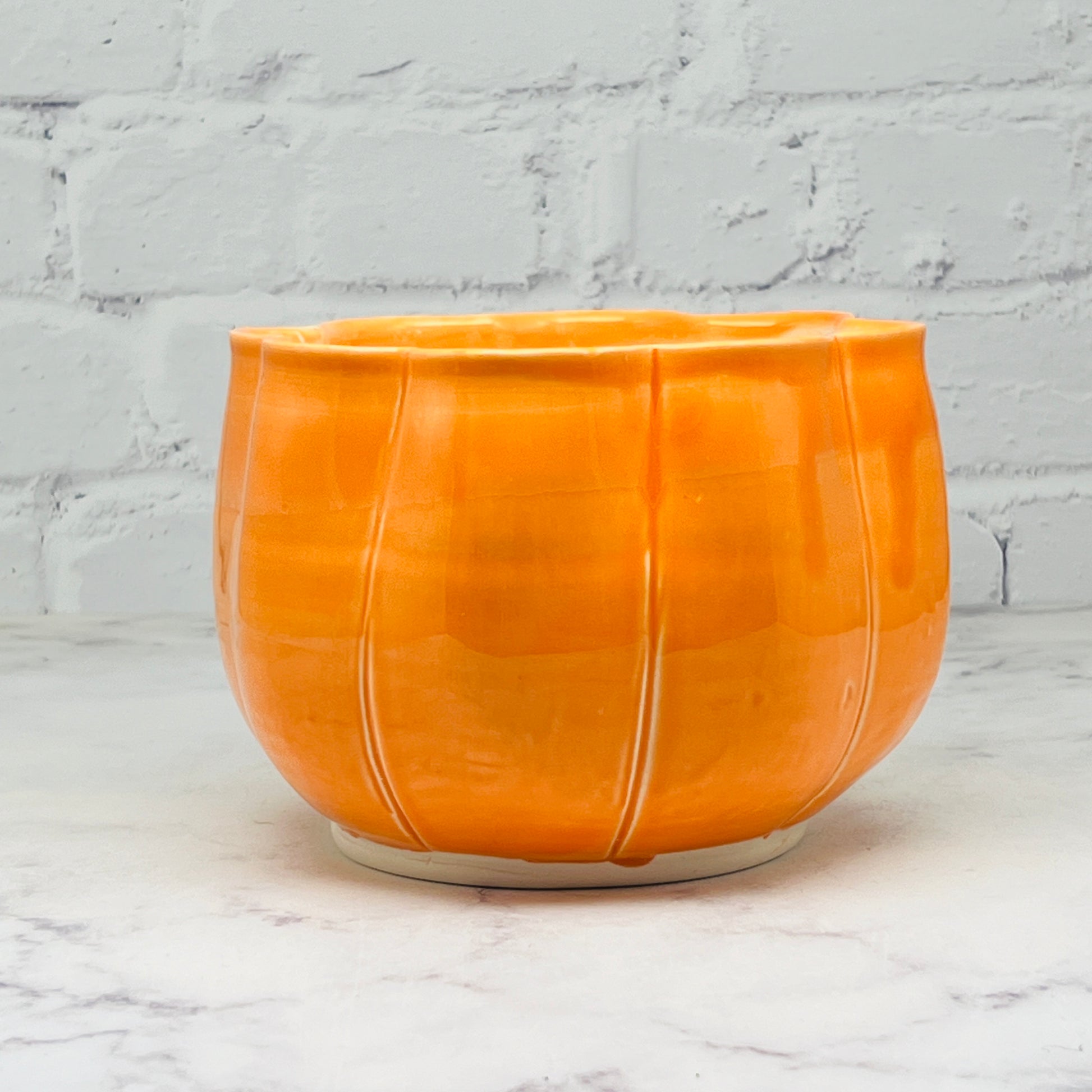 This adorable pumpkin bowl would make an excellent addition to your fall decor. It is wheel thrown and altered to look like a pumpkin.