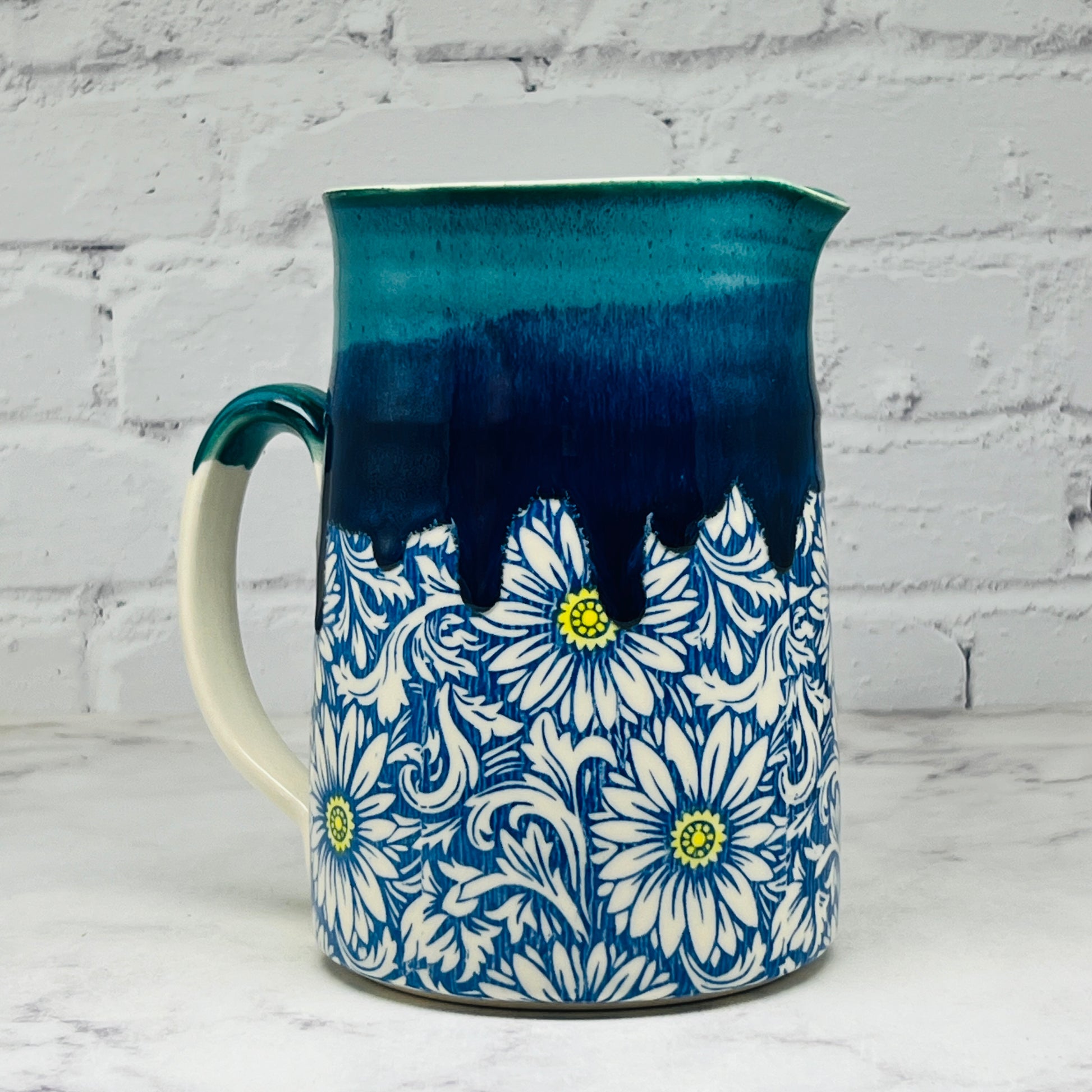 This adorable pitcher would be a great container for serving your favorite beverages. It has a unique design at the bottom and a beautiful glaze on top. It would make a great addition to your home or a great gift for a loved one.