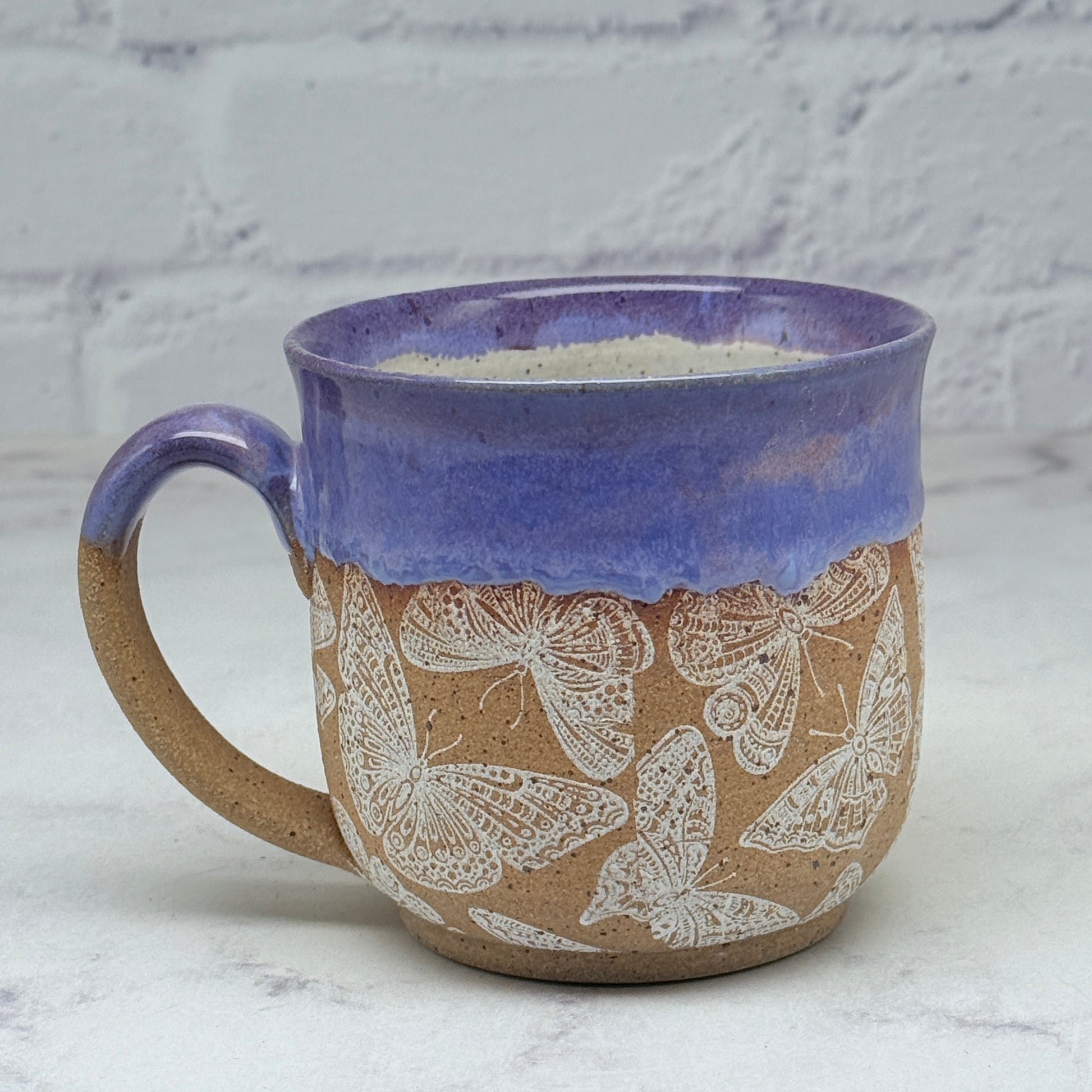 This adorable mug has unique design at the bottom that is unglazed and a beautiful glaze at the top. It would make a great addition to your collection or a great gift for a loved one.
