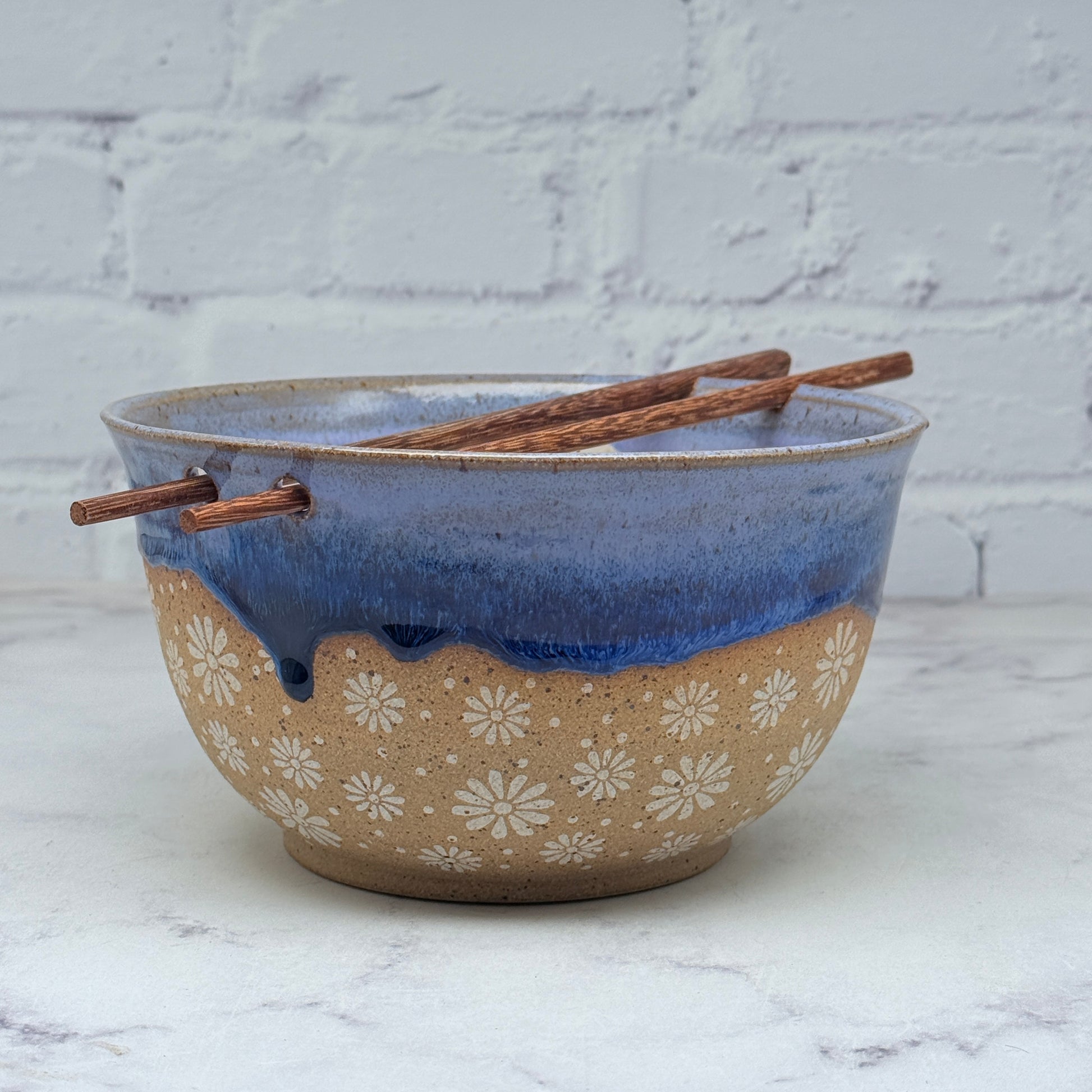 This bowl was made with Ramen lovers in mind. It has a built in system to hold on to your chopsticks when you are not using them. Each bowl includes a free pair of reusable wood chopsticks! It would make a great addition to your kitchen or a great gift for a loved one.