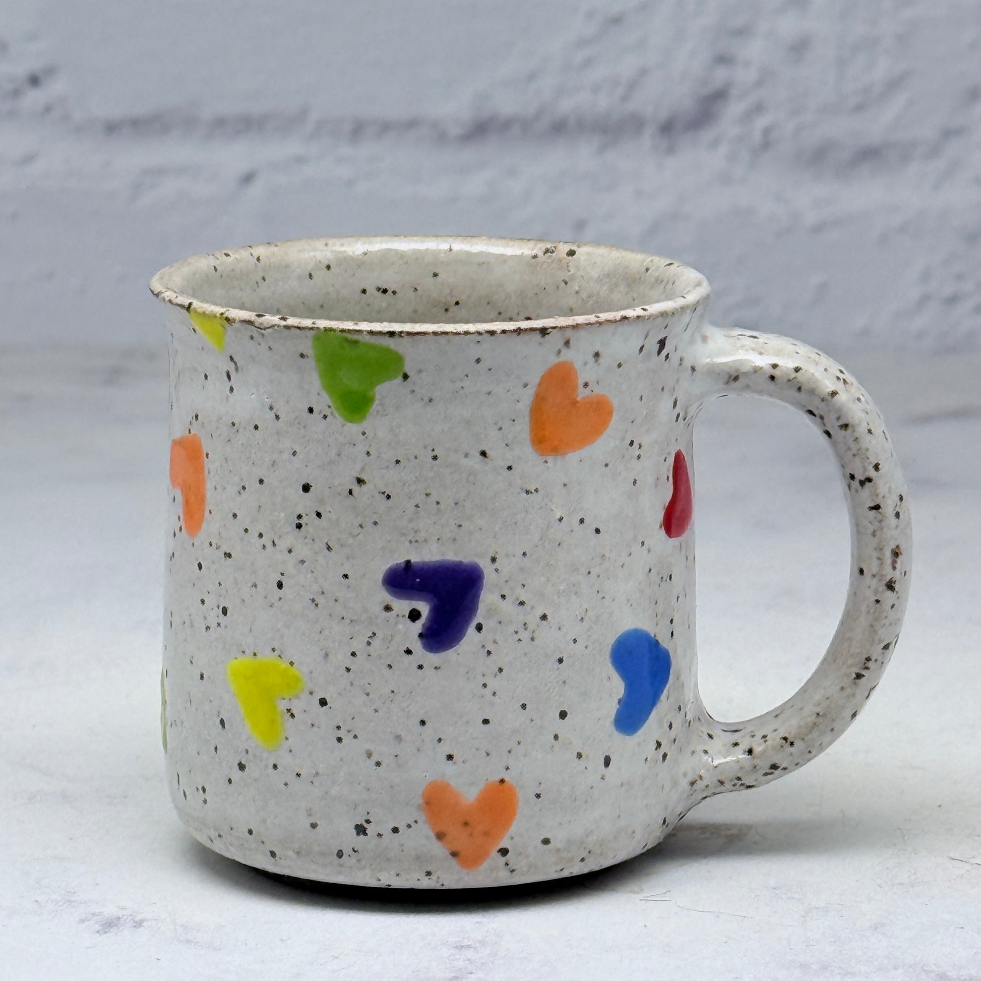 This adorable mug has a rainbow of little hearts placed randomly throughout. The hearts are handmade painted with overglaze that create a slightly raised surface. It would make a great addition to your collection or a great gift for a loved one.