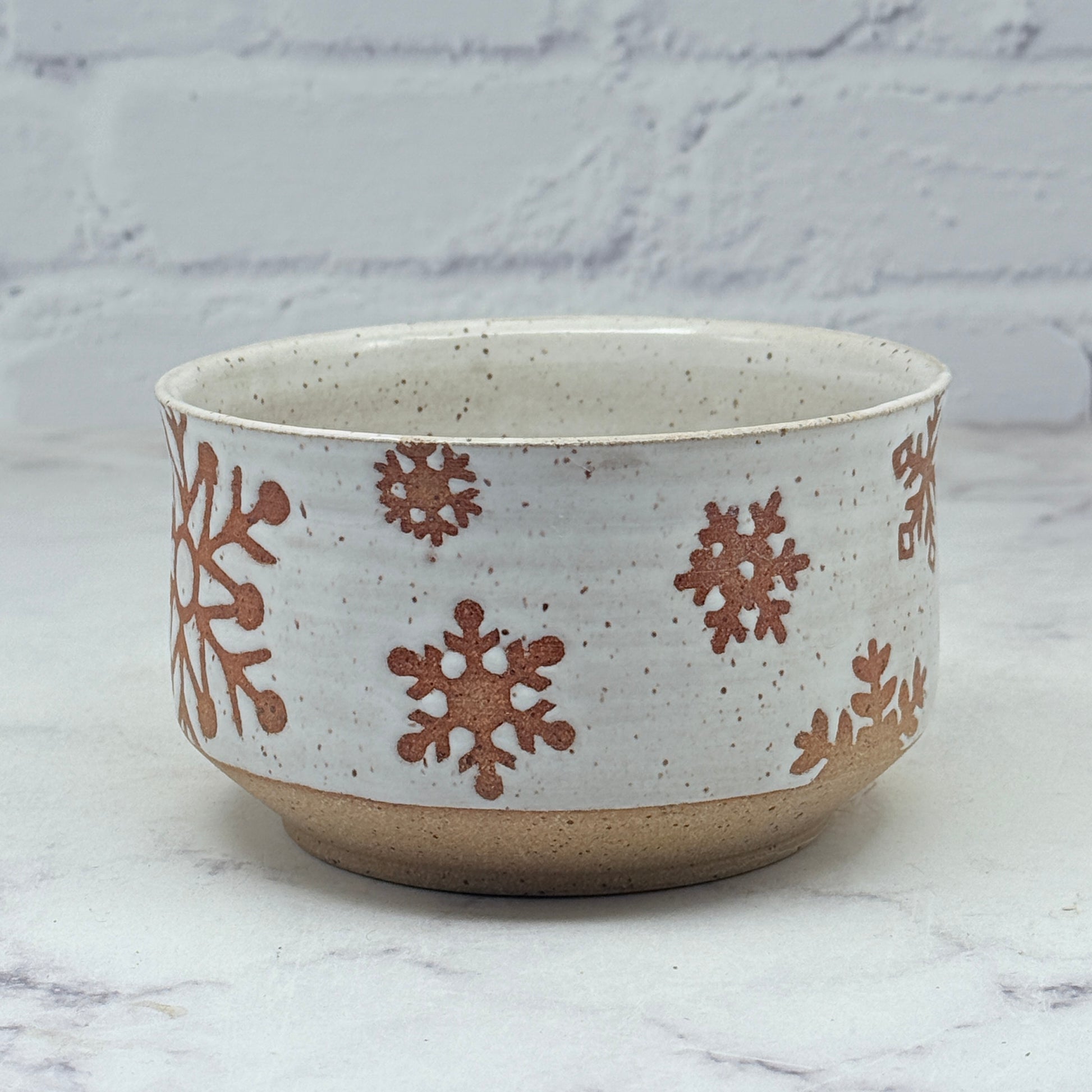 This bowl is a great versatile size. It is decorated with beautiful snowflake design throughout. The snowflakes are left unglazed. It would make a great addition to your kitchen or a great gift for a loved one.