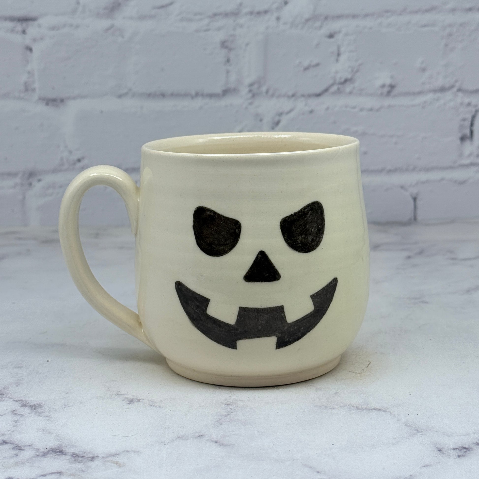 This beautiful mug has a unique pumpkin shape. The Jack-o-lantern face is hand painted with underglaze. It would make a great addition to your collection or a great gift for a loved one.