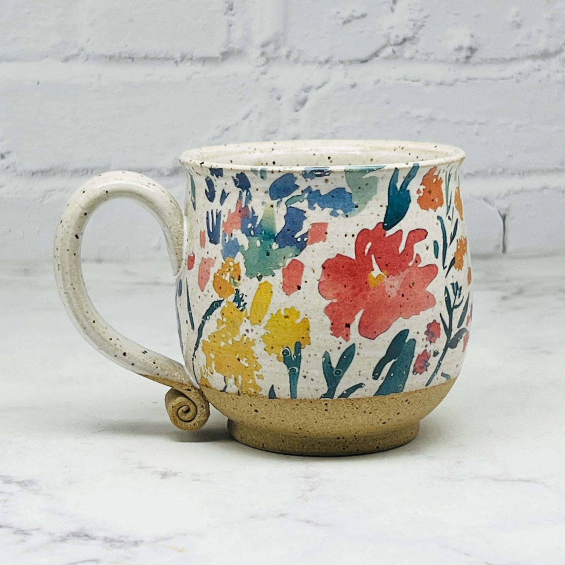 This beautiful teacup has unique decal design throughout. The bottom of the mug is left unglazed. It would make a great addition to your collection or a great gift for a loved one.