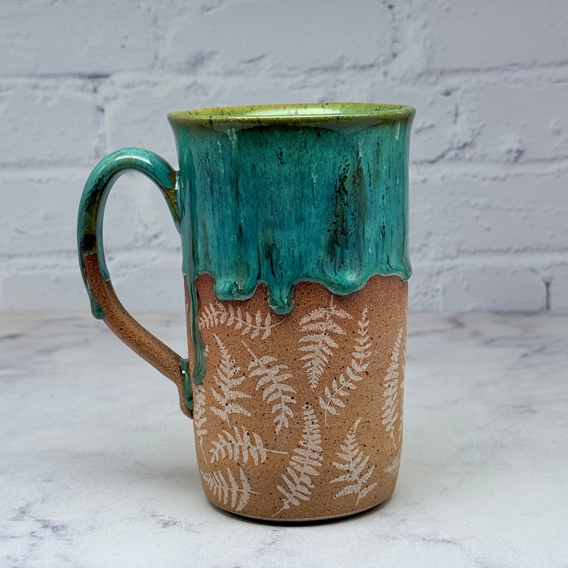 This beautiful mug has unique design at the bottom that is left unglazed and a beautiful glaze at the top. It would make a great addition to your collection or a great gift for a loved one.